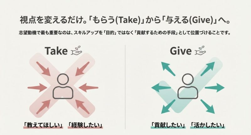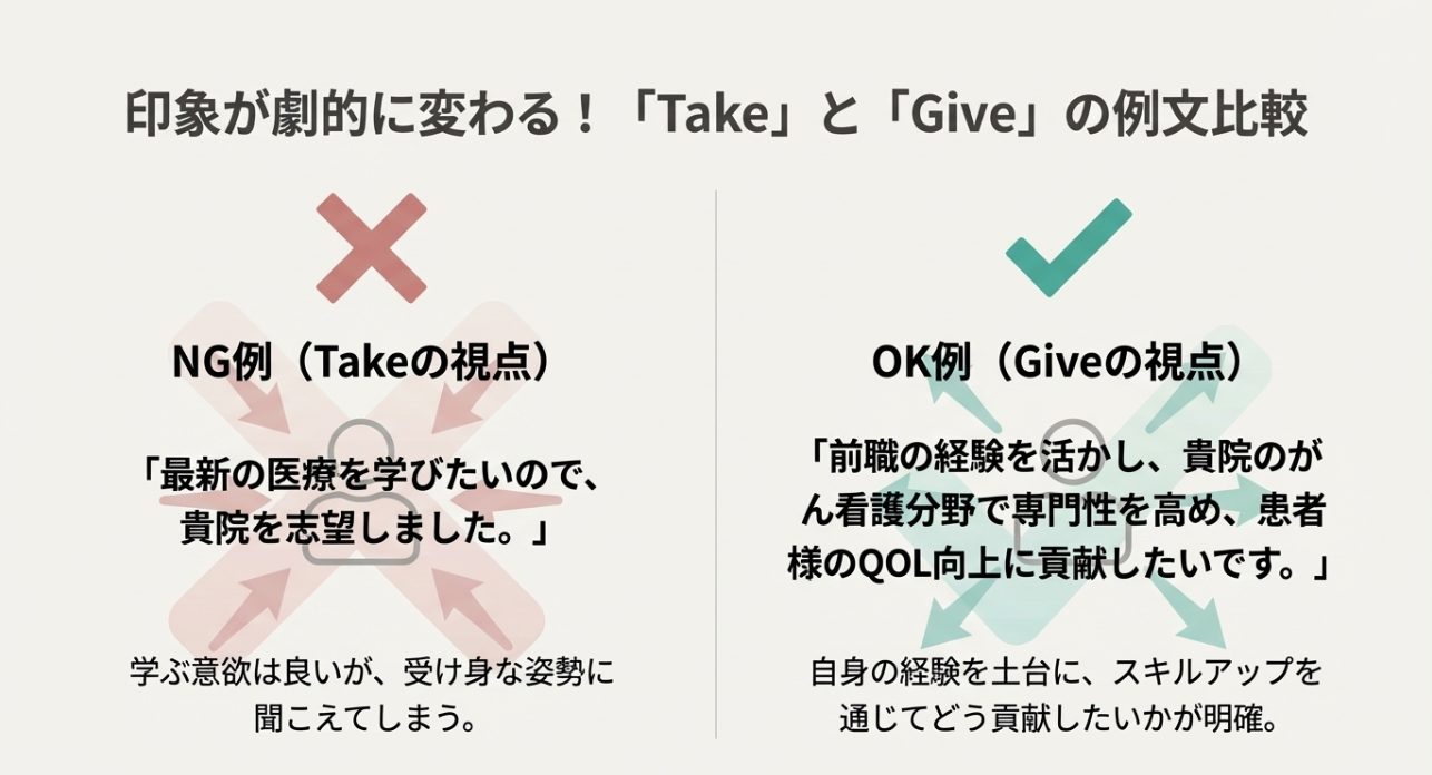 結論から言うと、学びたい気持ち自体が悪いわけじゃないです。 ただし、採用担当者が見たいのは、あなたの成長欲よりも「入職後に現場が回るか」「患者さんにプラスが出るか」。だから私は、スキルアップを目的として語らず、貢献のための手段に変換する書き方をおすすめしています。 いわゆるGiveの発想ですね。