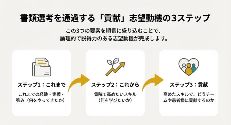 注意点として、面接では熱量が出る分、「学びたい」が先行しがち。 そこで、「学ぶことで患者さんに何を返せるか」「チームにどう貢献するか」を最後に必ず言って締めると、評価が安定します。 ここまで言えると、いわゆる“教育コストだけかかる人”に見えにくくなります。