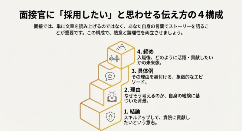 面接では「なぜそれがスキルアップなの?」「なぜ当院なの?」と深掘りされがちです。 ここで焦って話を盛ると危ないので、私は「前職で感じた課題→必要なスキル→当院の特徴→貢献」の順に戻すのがおすすめ。 どんな質問でも、この骨組みに戻せばブレにくいです。