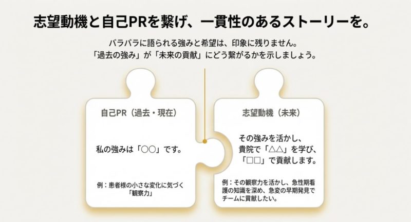 志望動機と自己PRを別物として書くと、文章がバラバラに見えます。逆に、自己PR(強み)と看護観(大事にしている姿勢)をセットにすると、「この人は現場で再現性がある」と伝わります。 ここ、ほんとにもったいないポイントで、自己PRだけ単体で頑張っても、志望動機と繋がっていないと評価が伸びにくいんですよね。