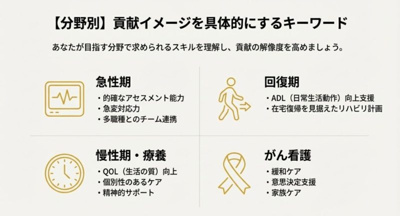 「スキルアップしたい」だけだと抽象的なので、できれば具体名にします。 たとえば、急性期ならアセスメント・急変対応・優先順位付け、回復期なら退院支援・ADL支援・多職種カンファ、慢性期なら長期療養のQOL支援・意思決定支援、訪問看護なら生活アセスメント・家族支援・地域連携、みたいに。具体名が出ると「この人、現場のイメージができてるな」と伝わるんですよ。