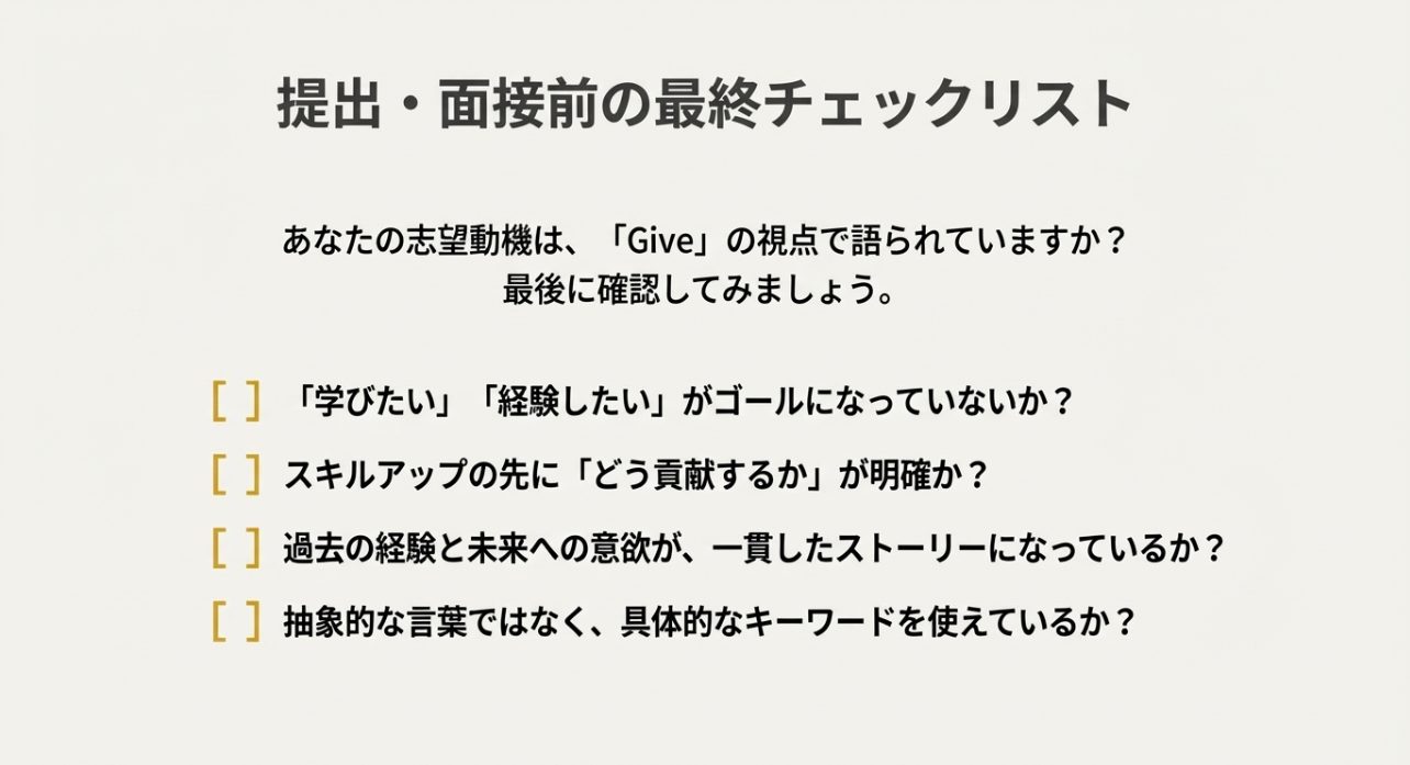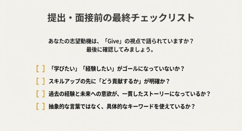 そして、看護師の転職で志望動機をスキルアップにするなら、最後の最後まで「自分が学びたい」ではなく「学んで、患者さんと職場に返す」に寄せるのがいちばん安全です。 文章を見直すときは、Takeっぽい表現(勉強させて、教えて、成長したいだけ、など)が残っていないかをチェックしてみてください。 もし残っていたら、貢献の一文を足すだけで印象が変わります。