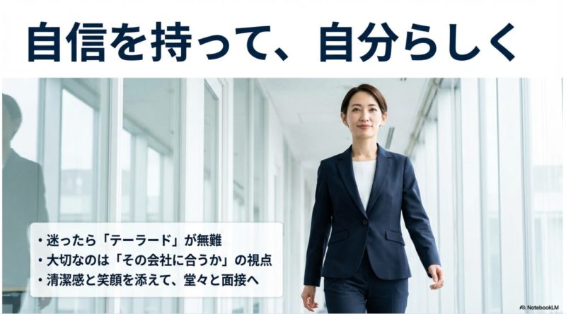 服装はあくまで評価要素の一部で、最終的には受け答え・経験・マッチ度が勝負です。 とはいえ、服で余計な減点を作らないのは本当に大事。 特に転職は、あなたの経験や成果が主役なので、服が主張しすぎると逆効果になりやすいです。