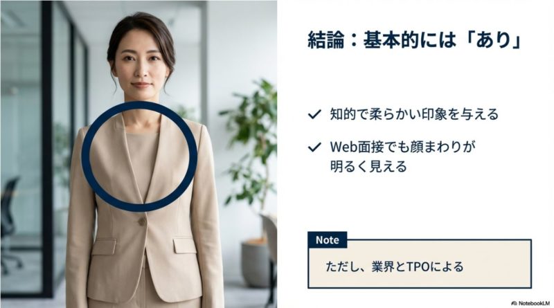 ベージュやオフホワイトは、顔色が明るく見えて好印象を作れる反面、業界によっては「カジュアル」「華やか」「場違い」に寄るリスクがあります。 ベージュって、上手くハマると柔らかくて素敵なんですけど、面接だと“説明が必要な色”になりやすいんですよね。 だから私は、ベージュは「使っていい場」と「使わない方がいい場」を先に分けた方が迷いが減ると思っています。