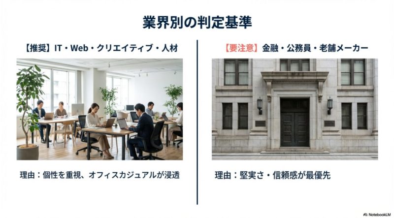 ここはまず「着ていいかどうか」を白黒つけます。 ただ、答えは一律じゃなくて、業界の保守度×デザインのフォーマル度で決まることが多いです。 私はこの2軸で判断できるようにしておくのが一番ラクだと思っています。