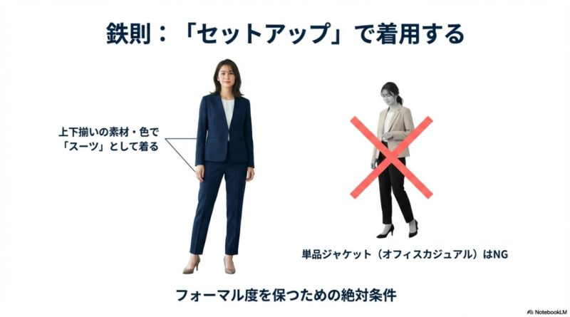 「面接は基本スーツで」と明記されている場合は、ノーカラーでもセットアップ(上下同素材)にして、きちんと感を担保するのが安全です。 上下が別素材だと、写真や照明で色味がズレて見えて、急に“間に合わせ感”が出ることがあります。 ここ、地味だけど大事です。