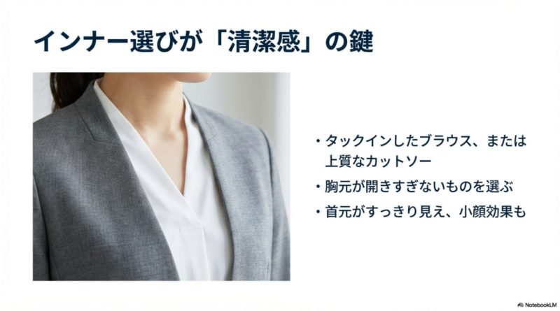 - インナーは白〜淡色、胸元は開きすぎない