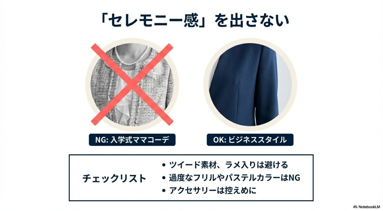 - セレモニーっぽいアクセや靴を合わせる(式典感が強まる)