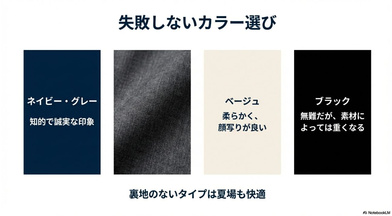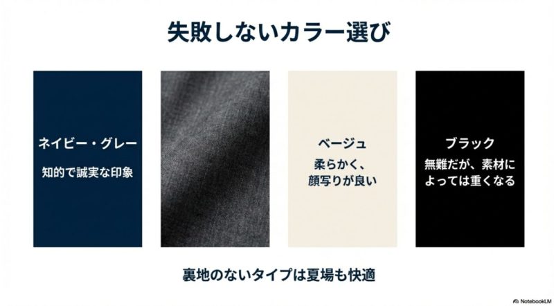 夏は汗で色が変わって見えたり、室内の照明でテカって見えたりします。 冬はコートの着脱でシワが出やすい。 だから、色だけでなく素材の耐久性や、防シワ性も含めて選ぶと安心です。 数値や仕様はメーカー公式が一番正確なので、買う前に公式サイトの素材表記や取扱い表示もチェックしておくのがおすすめです。