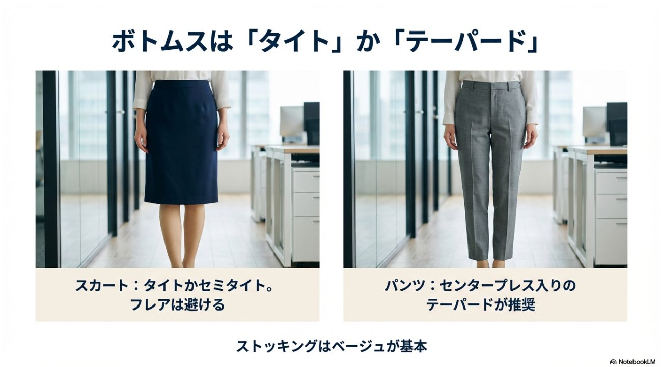 所作まで含めて「仕事ができそう」に見せるなら、私はタイト〜控えめフレアが安定かなと思います。 もちろん、体型や歩きやすさも大事なので、無理のない範囲で選んでくださいね。