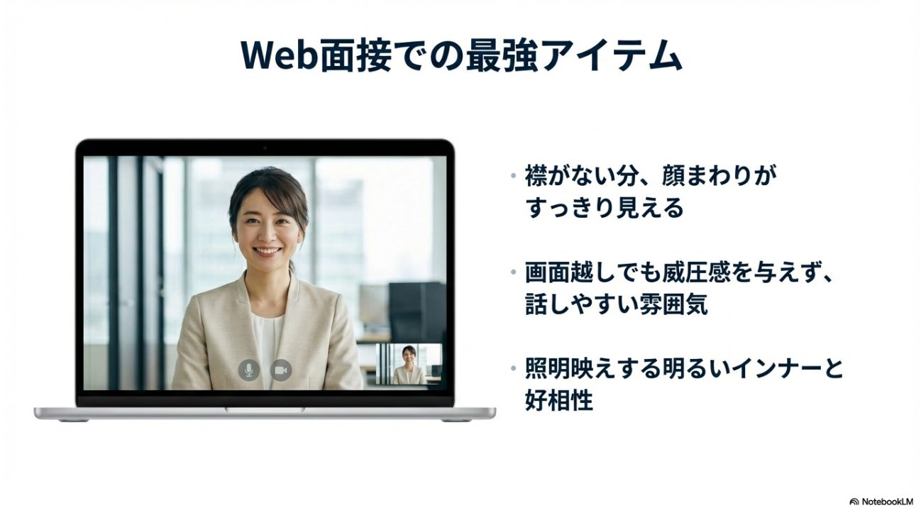 証明写真の目的は、おしゃれに見せることじゃなくて、「この人に会ってみたい」「一緒に働けそう」という信頼を作ること。 だから私は、写真用のノーカラーは、Vネック寄り+白系インナーで輪郭を出して、清潔感を強くするのが安定だと思っています。 クルーネック寄りでも悪くないですが、セレモニー感が出やすい素材(ツイードなど)は避けたいです。
