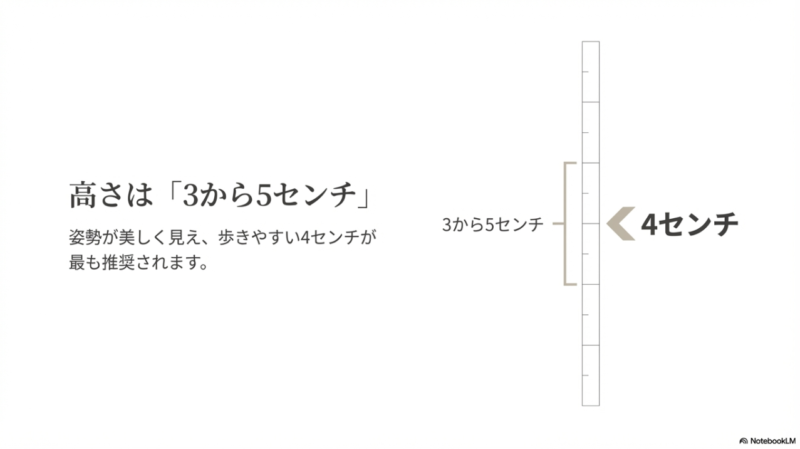 ただ、ここで大事なのは、3cm〜5cmという数字はあくまで一般的な目安だということです。 同じ4cmでも、ヒールの太さ、重心の取り方、靴底のクッション性、甲の深さで履き心地はかなり変わります。 細めの4cmヒールより、太めの4cmヒールのほうが安定しやすいことも普通にありますし、前滑りしやすい靴だと3cmでも疲れることがあります。 だから、数字だけで決めるより、実際に履いて歩いたときに自然に背筋が伸びるか、かかとが浮かないか、つま先に変な力が入らないかを見たほうが正確です。