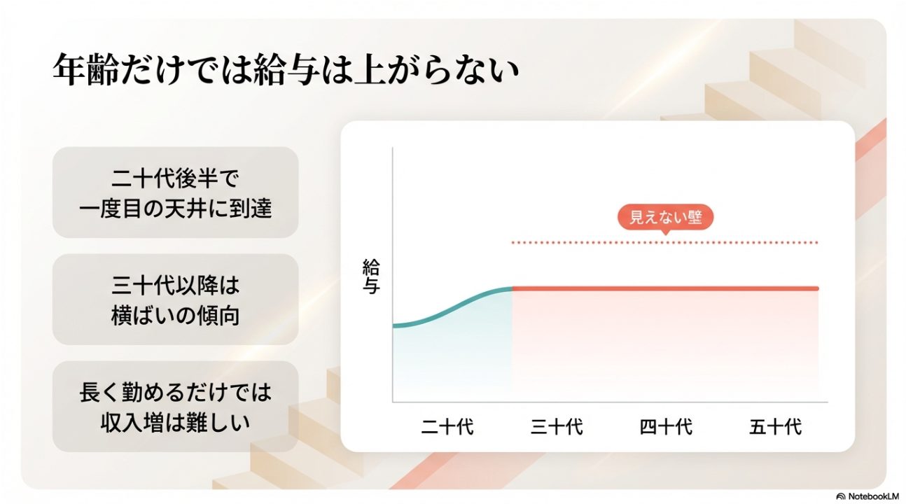 また、年齢や経験年数によっても伸び方に特徴があります。 一般的には20代で年収が徐々に上がり、30代前半でひとつのピークを迎えやすい一方、そこから先は自動的に大きく増えていくとは限りません。 つまり、長く勤めれば自然にどんどん上がる職種ではないという前提で見たほうが現実的です。 ここ、かなり大事ですよ。