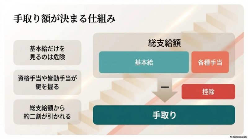 年収の数字だけを見ると高く感じても、賞与比率が大きい職場では毎月の手取りが伸びないことがあります。 生活の安定を重視するなら、月給ベースと手当の内訳も必ず見てください。