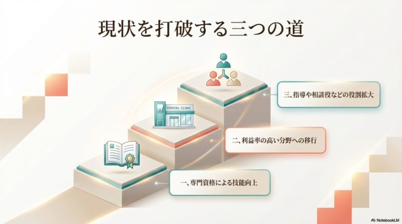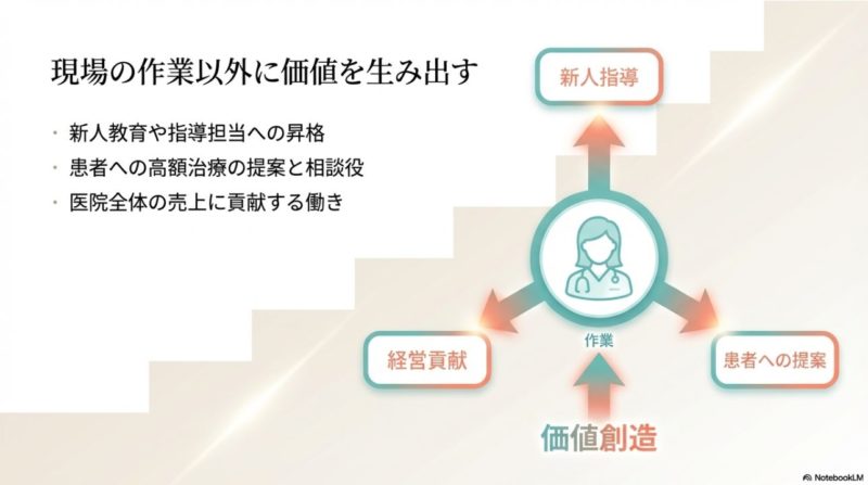 対策としては、院内で任される役割を増やすことが有効です。 たとえば、メンテナンスの継続率を上げる、後輩指導を担当する、カウンセリングを担うなど、売上や運営に結びつく仕事を増やすと評価されやすくなります。 ただチェアを回せる人ではなく、「患者満足」「再来院率」「自費提案」「教育」「院内改善」に貢献できる人になると、昇給や役職手当につながりやすいです。