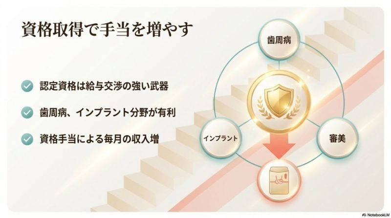 私は、資格は単なる肩書きではなく、自費診療や専門メンテナンスに関わる機会を広げる武器だと思っています。 手当そのものに加えて、より条件の良い転職先で評価されやすくなるのが大きいです。 たとえば、歯周病、インプラント、審美、ホワイトニング、小児分野など、医院の強みと合う資格を持っていると、「採用したい理由」が明確になります。 これは給与交渉でもかなり強い材料です。