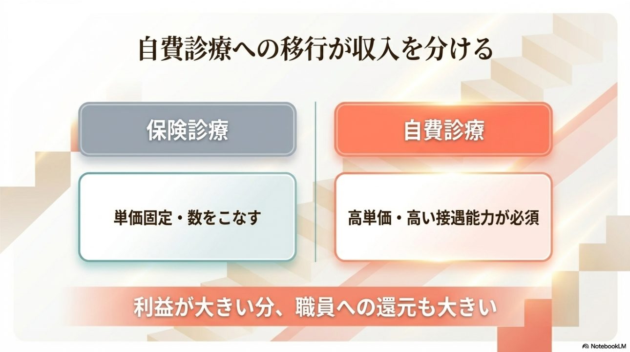 また、地域差を見るときは、単に平均年収だけでなく、「その地域で高待遇を出しているのはどんな医院か」を見たほうが実践的です。 たとえば、審美歯科、矯正、訪問歯科、インプラント、予防特化型など、強みのある医院は地方でも高待遇を出しやすいです。 つまり、地域差というより、ビジネスモデル差のほうが本質的なことも多いんですね。