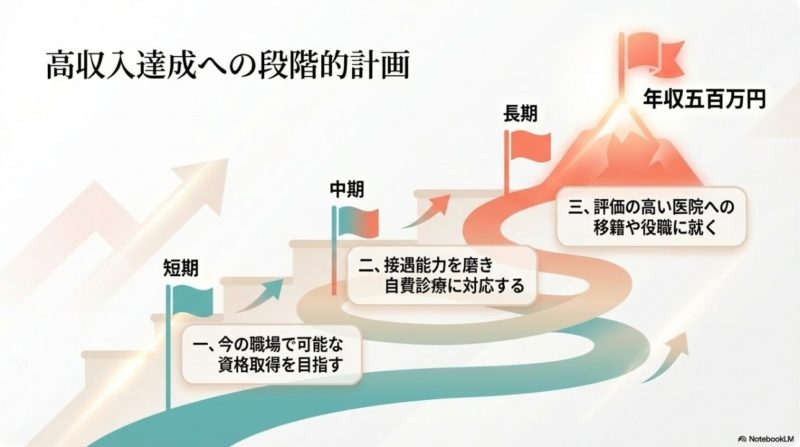 私は、年収500万円を目指すなら、資格取得、役職経験、自費診療への関与、転職時の交渉力の4つをセットで考えるのが現実的だと思います。 たとえば、数年の臨床経験を積みながら資格を取り、院内で教育や管理の役割も持ち、より評価される職場に移る。 この流れがつくれると、平均年収の壁を越えやすくなります。