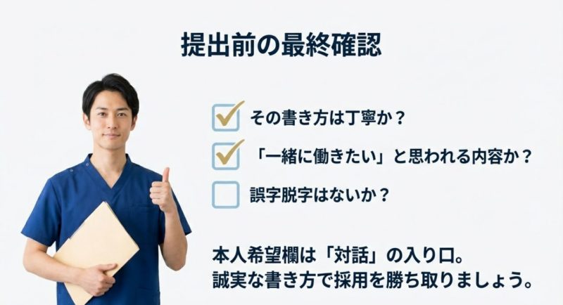 本人希望欄が空欄だと、「特になし」と同じ意味だと思われがちですが、読み手によっては違います。 特になしは“意図的に書いている”のに対して、空欄は“書き忘れ”にも見える。 看護師の仕事って、申し送り、記録、確認作業の連続なので、採用側はどうしても「確認できる人か」を見ます。 空欄だと、そこでマイナスを食らう可能性があるんですよね。