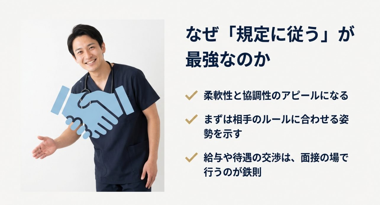 本人希望欄でよく使う定型文が「貴院の規定に従います」ですが、これって“何も考えてない”ではなく、「基本は貴院の方針に合わせます」という姿勢の表明なんです。 採用側から見ると、ここに柔らかく書ける人は、入職後の調整もスムーズに進みやすい。 だから、条件がない人にとっては強い一文です。