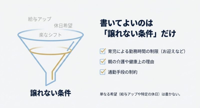 ポイントは、「できない」を「できる範囲」に変換すること。 たとえば「残業NG」より「17時までの勤務を希望」のほうが、採用側はシフト設計に落とし込みやすいです。 言い換えるだけで、あなたの印象が柔らかくなります。