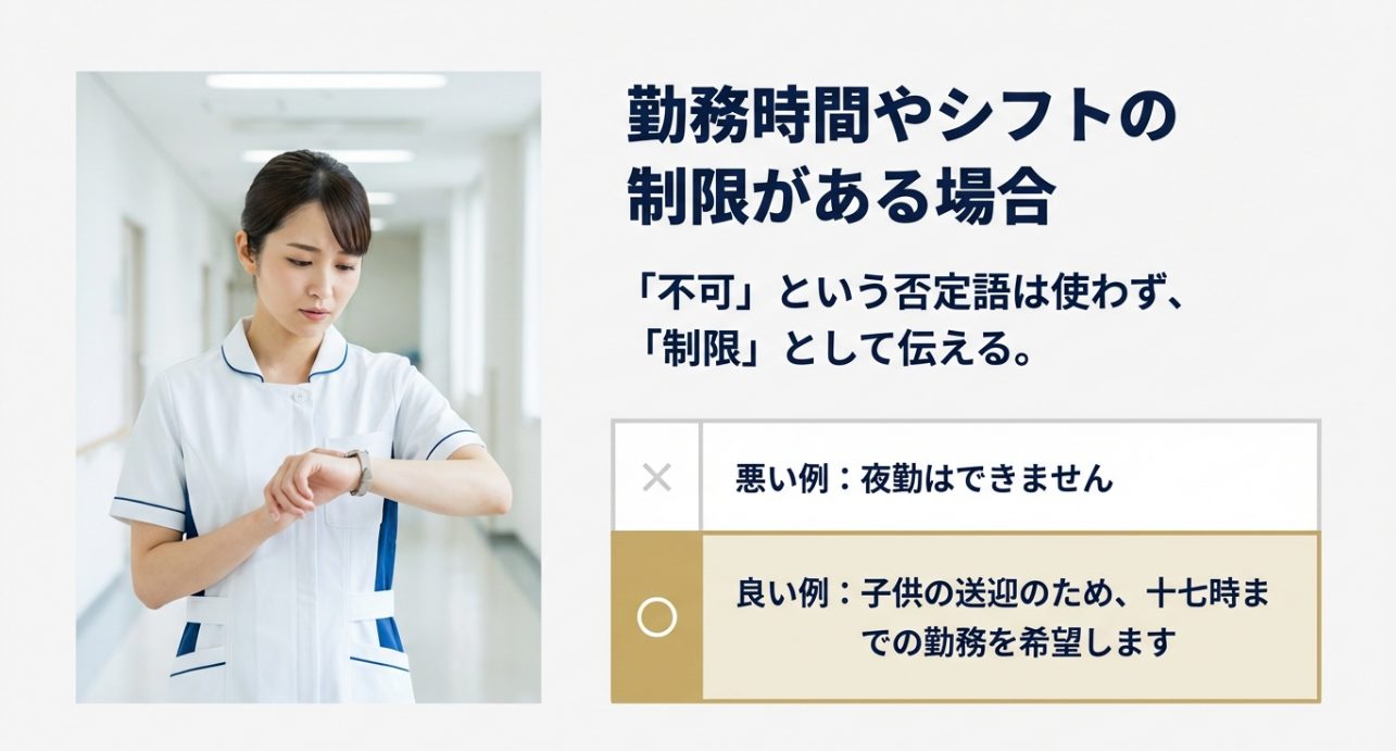 ここで注意。 譲れない制限があるのにこの一文だけ書くと、面接で「実は夜勤できません」と後出しになりやすく、誠実さを疑われる原因になります。 採用側の立場で考えると、シフトを組む前提で採用を進めていたのに、後から条件が出てくると現場の調整コストが跳ね上がるんですよね。