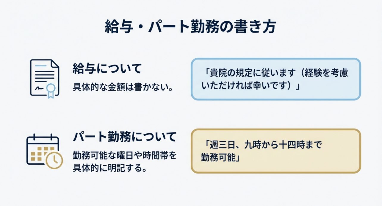 私は、譲れないことがあるなら「貴院の規定に従います」をベースにしつつ、例外事項だけを添えるのがおすすめです。 たとえば「原則は貴院の規定に従いますが、家庭の事情により日勤常勤を希望します」みたいな書き方です。 これなら協力姿勢は示しつつ、ミスマッチも防げます。