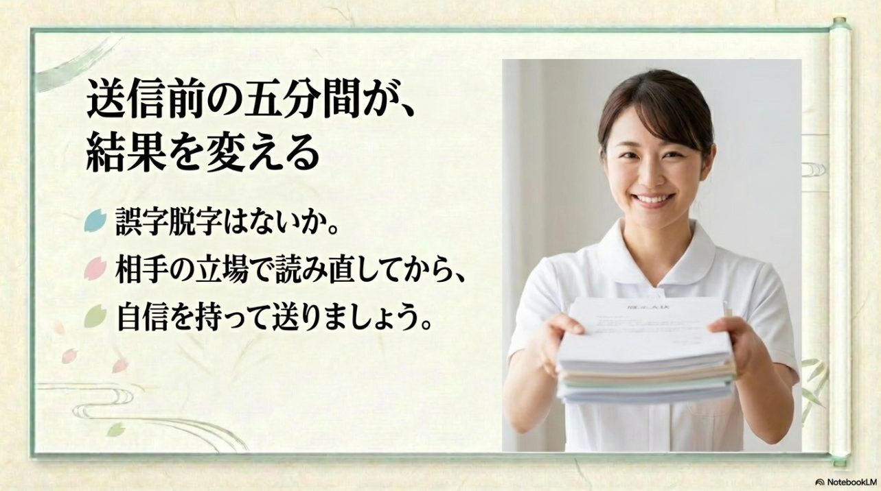 最後にまとめると、看護師転職の添え状で大事なのは、完璧な美文を書くことではなく、相手にとって見やすく、確認しやすい形に整えることです。  郵送なら添え状を付ける、内容は簡潔にする、自己PRは書きすぎない、封筒と入れ方まで丁寧に整える。  この流れを守れば、大きく外しにくいです。  添え状に悩んでいると、つい文章のうまさばかりに意識が向きますが、本当に大事なのは実務としてのわかりやすさです。