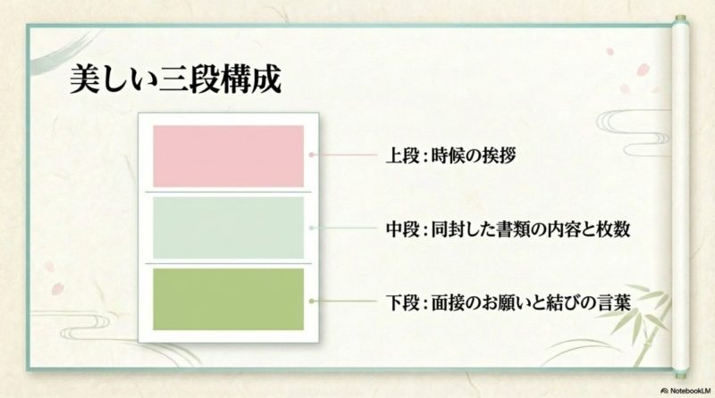 本文は、拝啓などの頭語、時候の挨拶、主文、敬具の順でまとめるのが一般的です。  ただ、最近は応募書類としての実務性を優先して、時候の挨拶を短くするケースもあります。  大切なのは、読みにくい長文にしないことです。  添え状はアピールの場というより、案内の場です。  応募経緯、書類送付の旨、査収のお願いが明確なら十分に役割を果たせます。