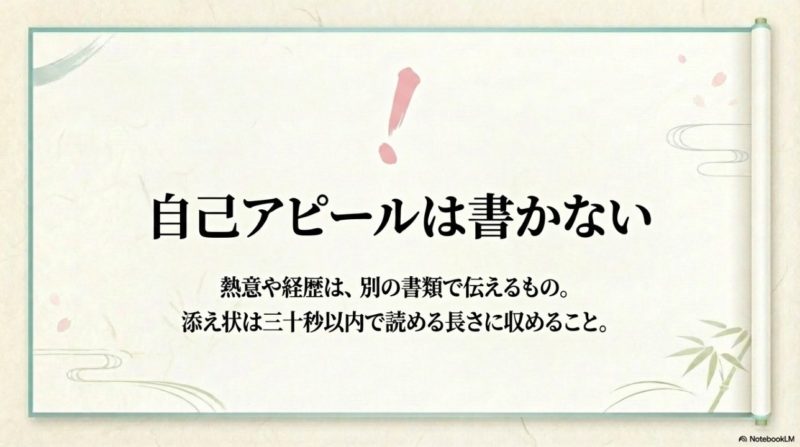 自己PRを盛り込みたい気持ちは自然ですが、添え状は盛る場所ではありません。  短く礼儀正しくまとめるほうが、かえって書類全体の完成度が上がります。