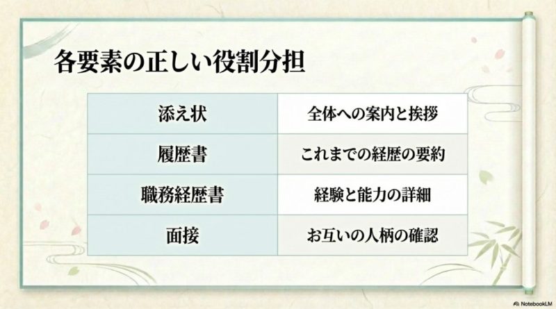 この整理ができると、書類全体の見せ方がかなり良くなります。  添え状は案内、履歴書は要点、職務経歴書は実績、面接は人柄と相性、という切り分けです。  ここが曖昧なままだと、全部の書類で同じことを言ってしまいがちです。  逆に役割分担ができていると、採用担当者はそれぞれの書類をストレスなく読み進められます。