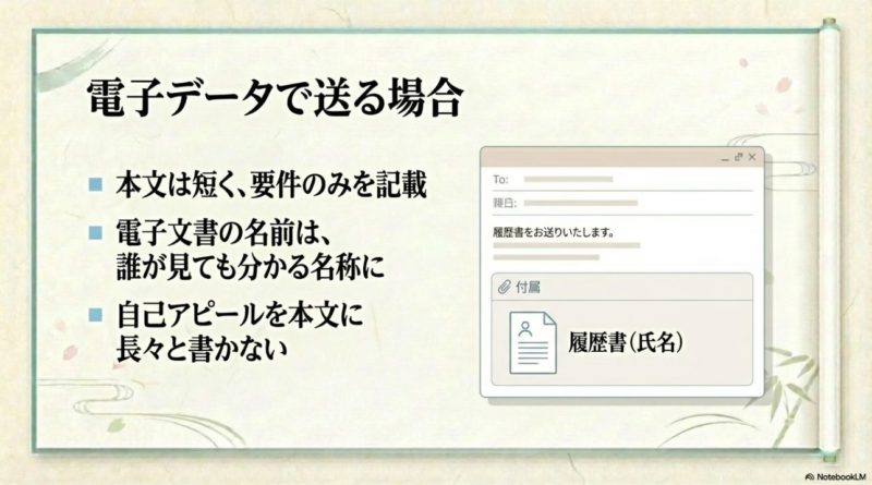 なお、ファイル形式や送信先、件名指定などは応募先によって異なります。  PDF指定かどうか、写真データの扱いなども含め、最終的な判断は募集要項や担当者の案内に従ってください。  スマホから送る場合でも、誤送信や添付漏れ、文字化けには注意したいです。  送信前に、自分宛てにテストで送って見え方を確認するのもありです。